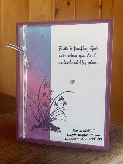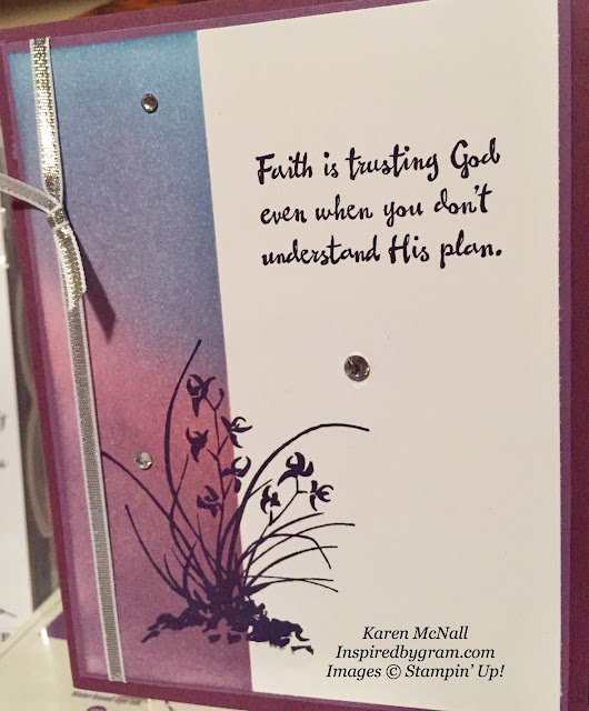 I’m getting ready for a craft show this coming weekend (March 10, 2018) and my inventory of Sympathy cards is pretty low. I came up with this design using sponge daubers and masking technique. The ink colors I used for sponging (top to bottom) were Marina Mist, Sweet Sugarplum, and Perfect Plum. All stamping was done using Elegant Eggplant.