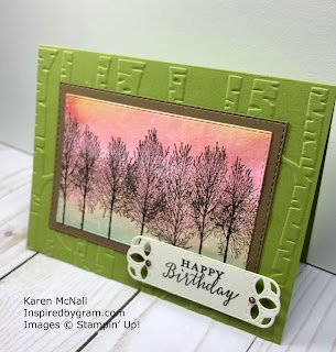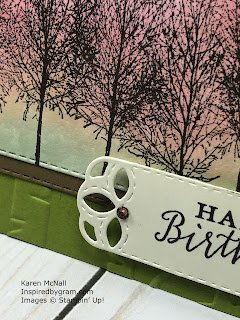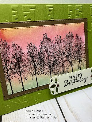 Once your paper dries; either on its own or with your heat tool, you can stamp using Winter Woods and Soft Suede ink. Once I had the trees stamped, I then die cut using the Rectangle dies. A larger rectangle die was used to die cut the Soft Suede card stock.
