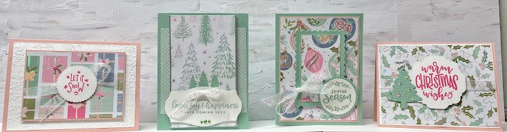 It’s been two weeks, but I’m back. We will be making these four gorgeous cards Friday night. You may recognize these from my previous email earlier in the week. It’s November card club! I brought these cards to my In-person class this week and everyone loved them; even though they are non-traditional Christmas colors. Mint Macaron and Blushing Bride. Nice pastels.