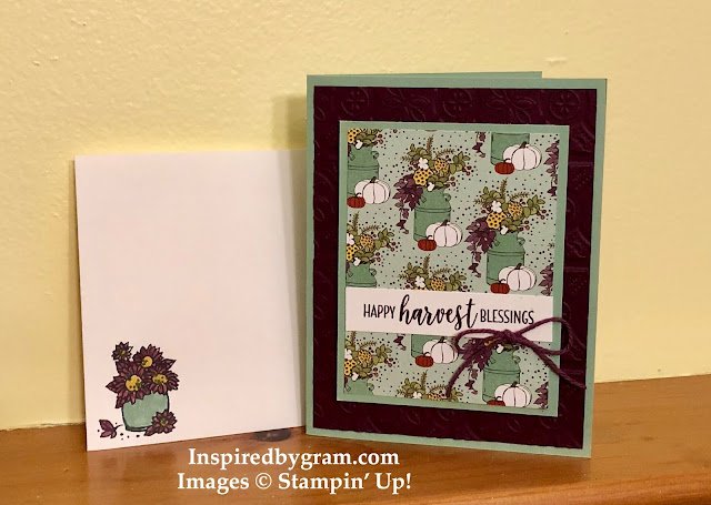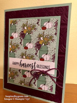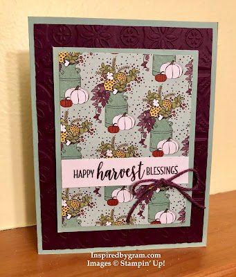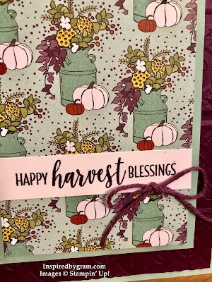 When I think of Thanksgiving colors, yellow, red, and orange come to mind.  Take a look at the Country Lane Designer Series paper.  Mint Macaron, Blackberry Bliss, and Crushed Curry.  Three of my favorite Stampin’ Up! colors but not your typical Thanksgiving / Fall Harvest colors.