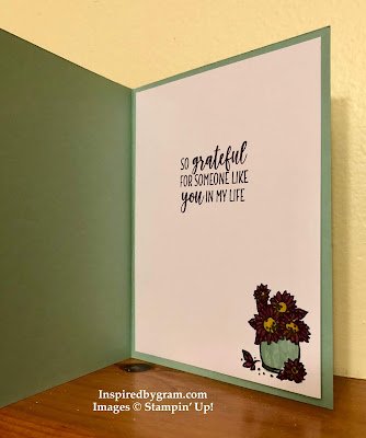 For the inside panel, I used a sentiment from Country Home.  This is stamped using Blackberry Bliss ink.  The flower image is from Many Blessings stamp set.  I stamped the flower image using Memento Black.  I colored the image using Stampin Write markers:  Rich Razzleberry, Crushed Curry, and Mint Macaron.  Add a little sparkle with Wink of Stella.