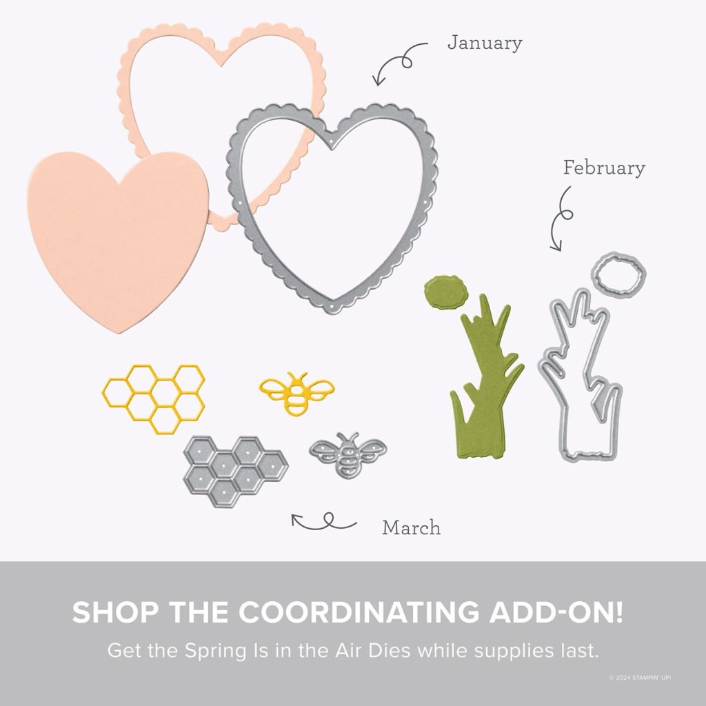 Make the most of your Paper Pumpkin kits with the Spring Is in the Air Dies add-on! Quickly and cleanly cut out a heart frame, flowering chive, honeycomb, or tiny bumblebee to elevate your crafting projects. These additional dies are designed to work with THREE Paper Pumpkin Kits: Hearts for You Paper Pumpkin Kit, the Spring Is in the Air Paper Pumpkin Kit, and the Daisy Daydream Paper Pumpkin Kit. Pair these dies with other Stampin’ Up! products for even more creative options! Click here to place your order today!