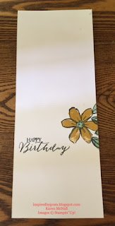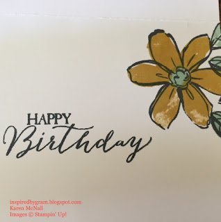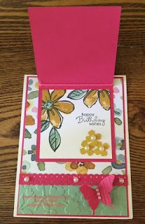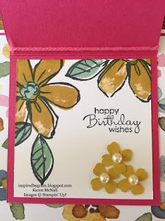 Open the card up to the next layer and you will find another flower stamped with the same colors. Happy Birthday is from Butterfly Basics stamp set. I added some Hello Honey Itty Bitty flowers using the punch and added some pearls.
