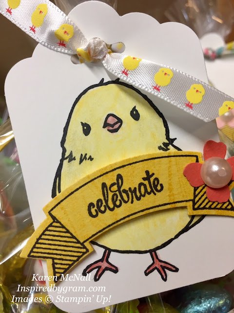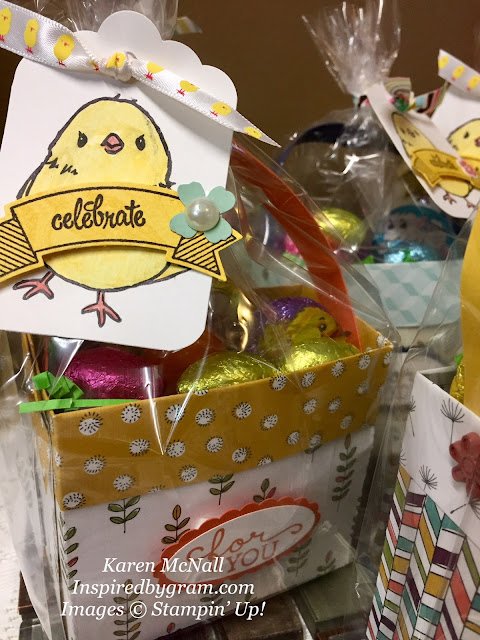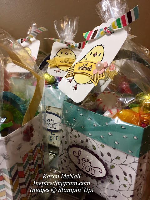 The bag was created using retired designer series paper.  Each bag is filled with Easter candy and packaged with a clear bag.