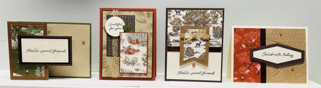 | Purchase $50* or above from my online store and receive four beautiful card kits featuring Autumn Toile Designer Series Paper. Just in time to create your fall cards for this coming season. Paper Description: Bring an air of sophistication to your fall crafting with the Autumn Toile 12″ x 12″ Designer Series Paper. Featuring intricate imagery of trees, pumpkins, animals, and more, the toile wallpaper-inspired designs add a timeless elegance to your harvest-season projects. Video Tutorial: Click here or on the video image below for your free tutorial. *Orders do not include sales tax, shipping costs, or Stampin’ Rewards being used to reach $50 minimum. |