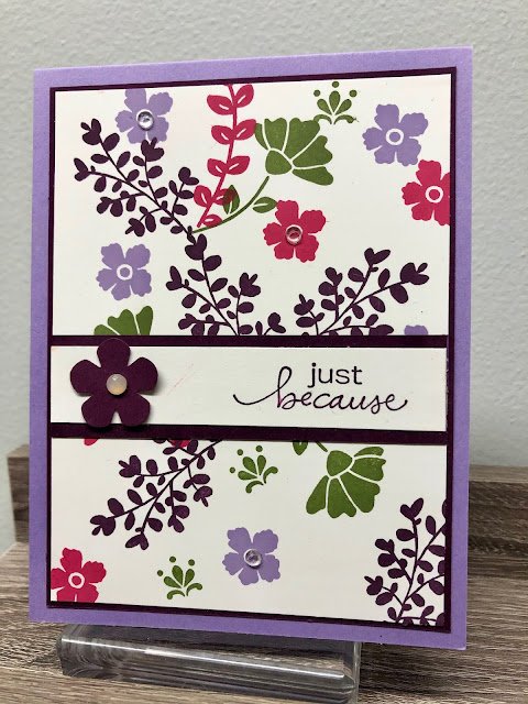 Here’s our Simple Stamping Sunday card. We are using Lovely You for a Just Because card. My color palette started with Highland Heather and then coordinated with Blackberry Bliss, Mossy Meadow, and Melon Mambo.