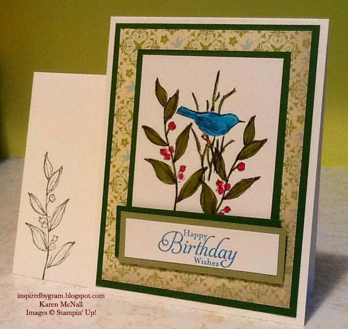 I used Stazon Jet Black Ink to stamp the images. Stampin Write markers to color in the images, Tempting Turquoise for the sentiments, and Garden Green for the leaf/berry pattern on the envelope.