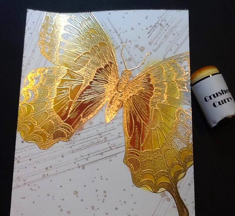 Once cool, use your sponge daubers, work from the middle to the outside with variations of Cajun Craze and Crushed Curry. It’s okay if you go outside the lines. Clean off sponged ink with a tissue as the ink will not adhere to the embossed image.
