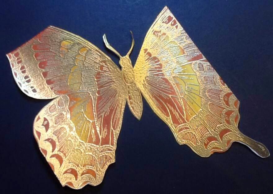 Using your VersaMark ink, Whisper White scrap, and the Swallowtail stamp, ink up really well. Take your Embossing Buddy and rub it across your stamped Whisper White (to the left). Stamp your Swallowtail onto this piece, being careful not to rock your stamp. Then we add Gold Embossing Powder and use our Heat Tool to make some magic Gold! Let your embossed card cool.