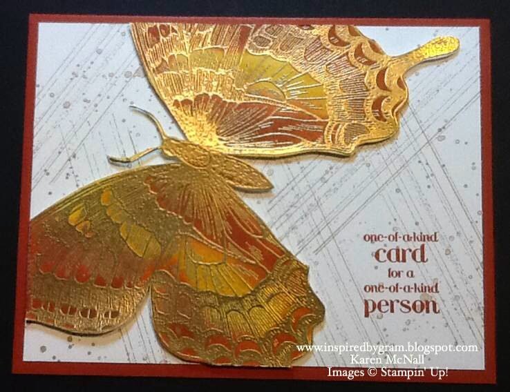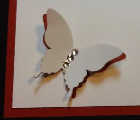 Add the Whisper white that has the sentiment stamped on it to the Cajun Craze cardbase. Next we add Stampin Dimentionals to the backside of the embosed Swallowtail. Add the Swallowtail to the Whisper White carefully lining up the sides so that they match.