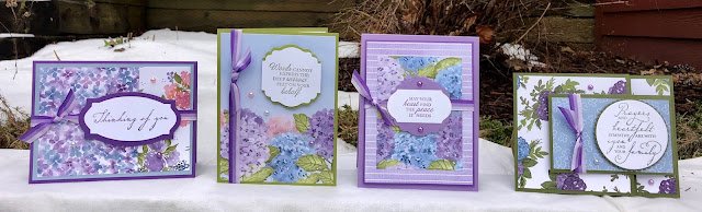 This is a Thinking of You / Sympathy Card Class offering, which includes Hydrangea Hill Designer Series Paper, Pastel Pearls, and either Tricolor Purple Ribbon or Gorgeous Grape Sheer Ribbon (whichever is available). Images show Tricolor. Will substitute sheer ribbon if necessary. I will also send you a 6×12 full pack of Sale-a-bration Designer Series Paper!