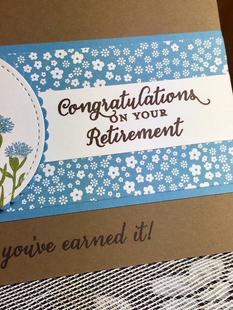 It’s a two step stamp with three different flower designs.  Here is a card I created today for a friend of mine that is retiring in March.